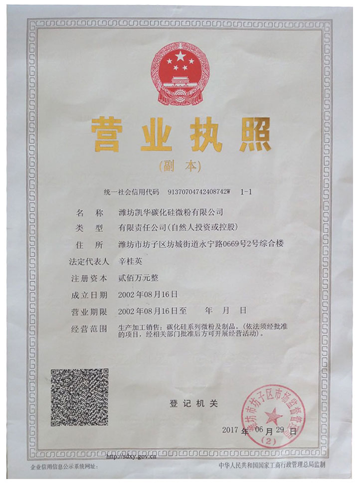 濰坊凱華碳化硅微粉有限公司成立于2002年,國家高新技術企業,公司占地40畝,標準廠房19000平方,辦公樓、研發2000平方,年生產能力3萬噸。一直從事陶瓷級微粉的生產銷售,所生產的微粉具有純度高、粒形好、穩定性強等特點,主要用于反應燒結、無壓燒結、硅碳棒新工藝、汽車尾氣處理(DPF)、納米隔熱保溫、機車制動、防腐涂料、研磨拋光、橡膠樹脂等領域。標準產品有:F240、F1200、W40、W28、W20、W14、W10、W7、W5、W3.5、W2.5、W2、W1.5、W1、W0.5、D3E、5S、100F及整形高密度系列綠碳化硅微粉,廣泛應用于燒結、防腐、研磨拋光、涂腐等廣大領域。